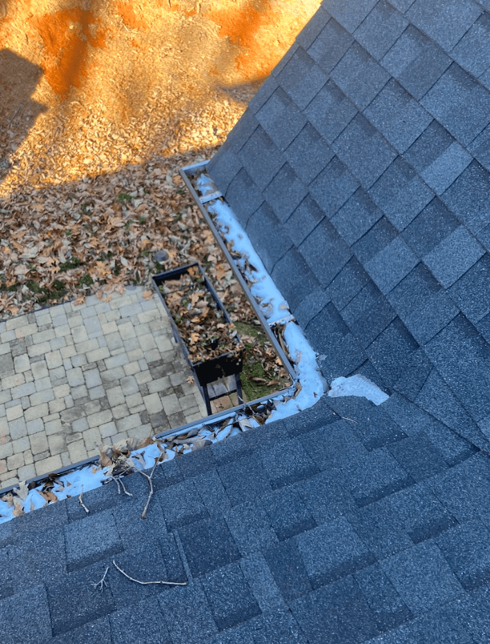Leaves, sticks, pine needles, and compacted debris are removed by hand to prevent clogging inside the downspouts.